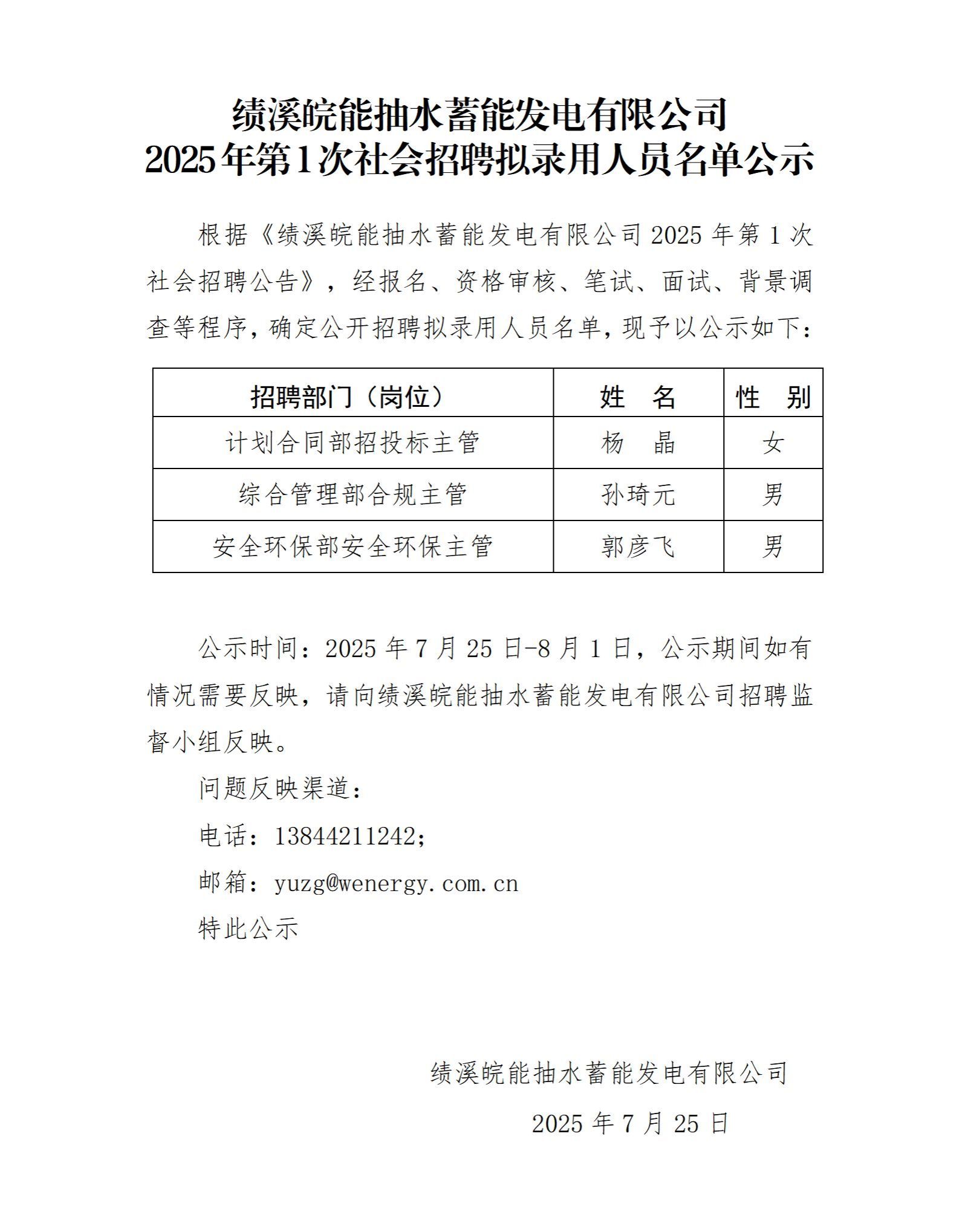 绩溪Z6尊龙凯时抽水蓄能发电有限公司2025年第1次社会招聘拟任命职员名单公示