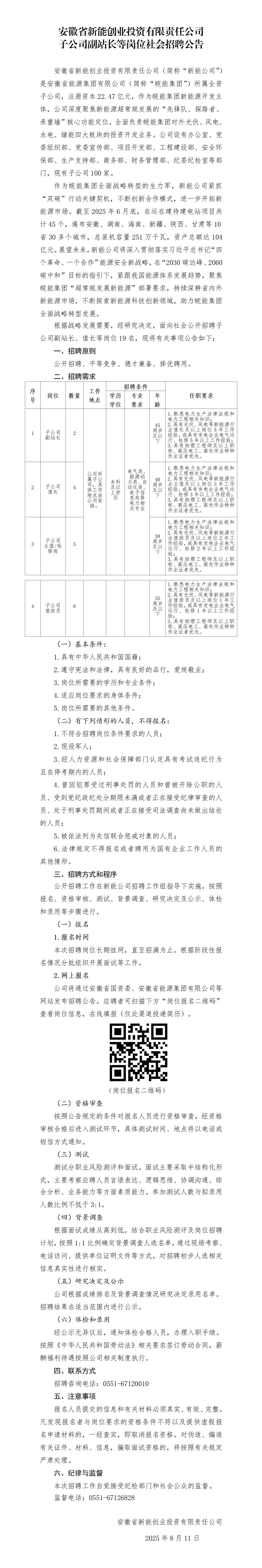 安徽省新能创业投资有限责任公司子公司副站长等岗位社会招聘通告